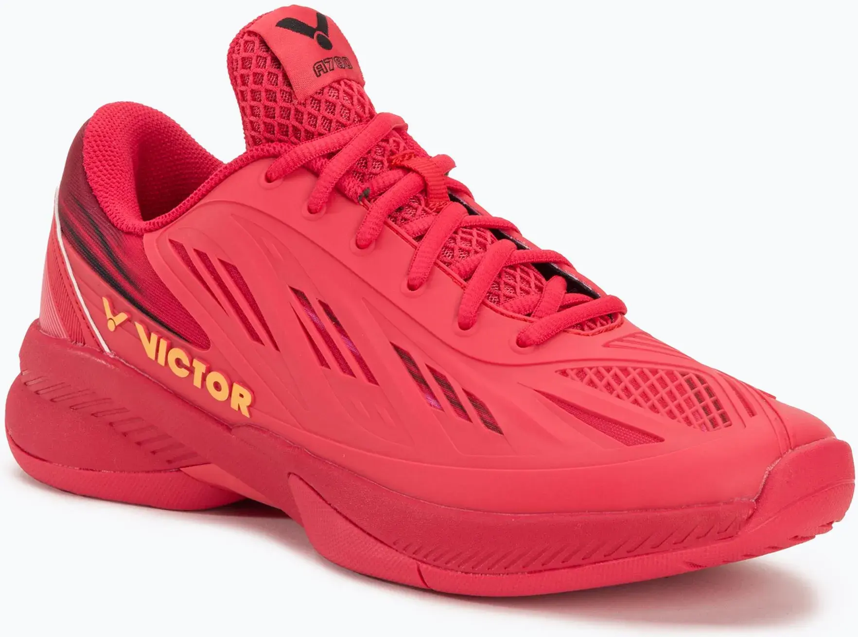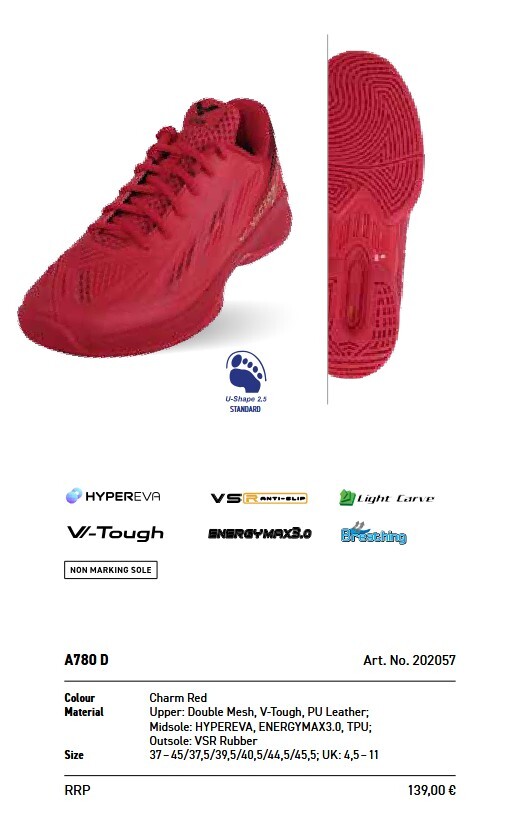 De VICTOR A780 D in zijn opvallende rood/goud/zwarte kleurstelling is meer dan alleen een badmintonschoen; het is een statement van kracht en stijl op de baan, ontworpen voor de speler die compromisloze prestaties en een unieke uitstraling eist. Dankzij de geavanceerde Energymax 3.0 demping biedt deze schoen een explosieve schokabsorptie en een uitstekende veerkracht voor snelle, wendbare bewegingen, terwijl de duurzame VSR Anti-Slip buitenzool zorgt voor de nodige grip tijdens snelle richtingsveranderingen, waardoor u met een voorsprong van elegantie en agressie aan elke rally begint.