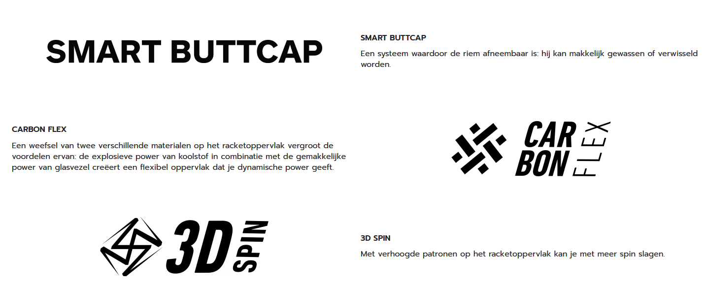 In tegenstelling tot pure carbon rackets, gebruikt de Veron-lijn Carbon Flex. Dit is een weefsel van zowel carbon (voor explosiviteit) als glasvezel (voor elasticiteit).