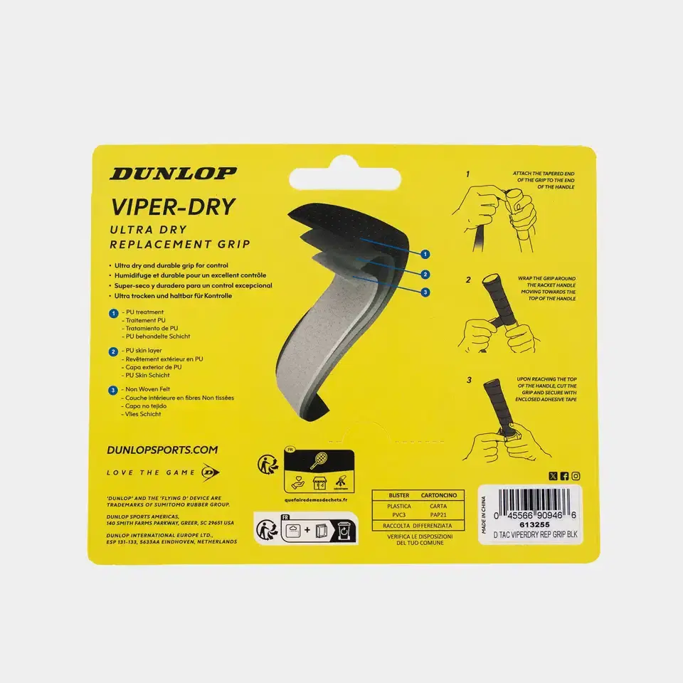 De Dunlop Viper-Dry Replacement Grip in Black is een hoogwaardige vervang grip die ontworpen is voor spelers die maximale controle, comfort en grip zoeken op hun racket. Met zijn ultradunne structuur biedt deze grip het gevoel van je racketblad direct in de hand, terwijl je tegelijkertijd profiteert van verbeterde demping en stabiliteit tijdens intensieve rally’s.
