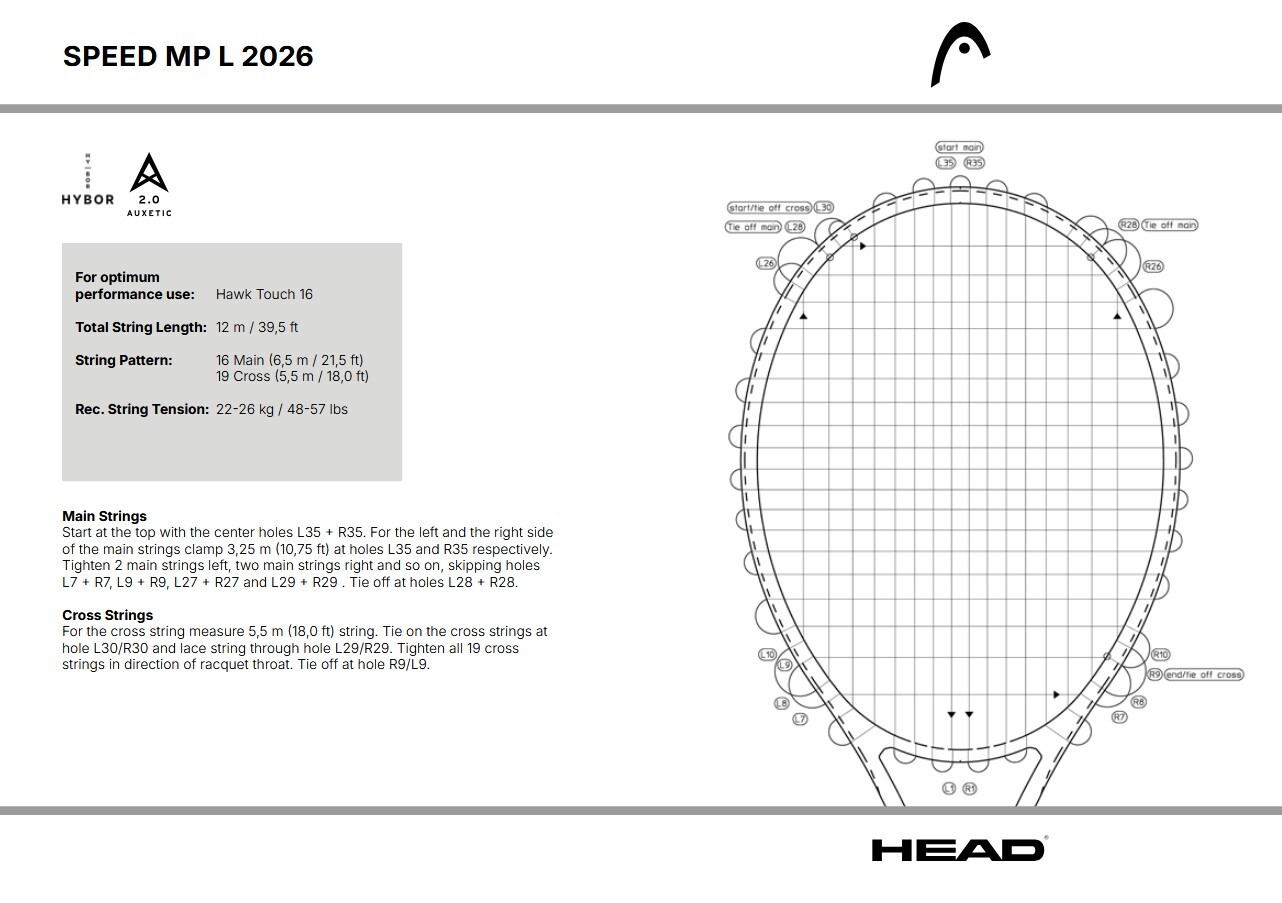 Laat je snelle spel floreren met de SPEED MP L 2026, een lichtere versie van de SPEED MP 2026, waardoor deze wendbaarder en eenvoudiger te hanteren is. Intermediaire spelers en gevorderde junioren kunnen alles doen met een racket dat een ideale mix biedt voor power en controle. Het is onderdeel van de bestverkopende SPEED-serie, aanbevolen door Jannik Sinner, en staat centraal in het ‘Tennis Tour Racquet Compass’ van HEAD. Met zijn 16×19 SPEED snarenpatroon heeft deze allrounder precieze kracht en is 5 gram zwaarder dan de vorige versie, wat zich vertaalt in een lichte toename in power. De introductie van Hy-Bor – een hypermoderne materiaalmix die voornamelijk wordt gebruikt in de hightech lucht- en ruimtevaartindustrie – in de schacht verbetert de waargenomen stabiliteit en het kenmerkende solide impactgevoel. De innovaties bevatten ook Auxetic 2.0-technologie voor een beter verbonden gevoel met de bal. Metallic kleuren en een matte afwerking geven de SPEED-serie een frisse en eigentijdse draai aan het iconische zwart-wit ontwerp.