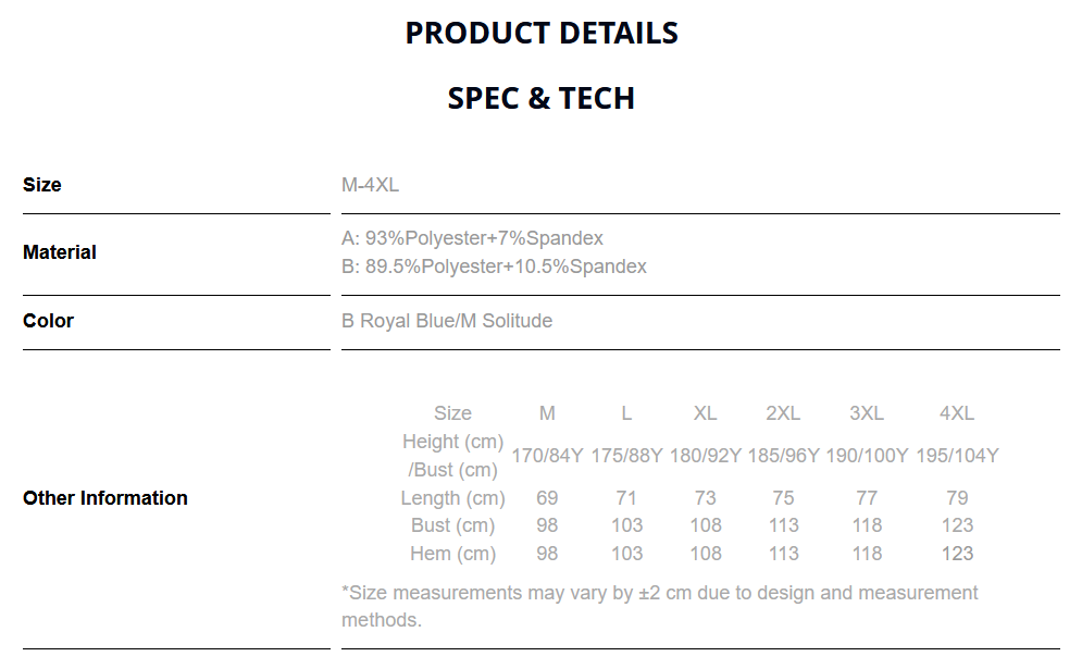 | Materiaal | Stof A: 93% Polyester, 7% Spandex | Stof B: 89.5% Polyester, 10.5% Spandex |